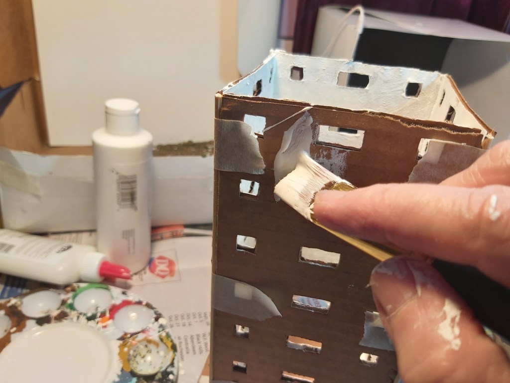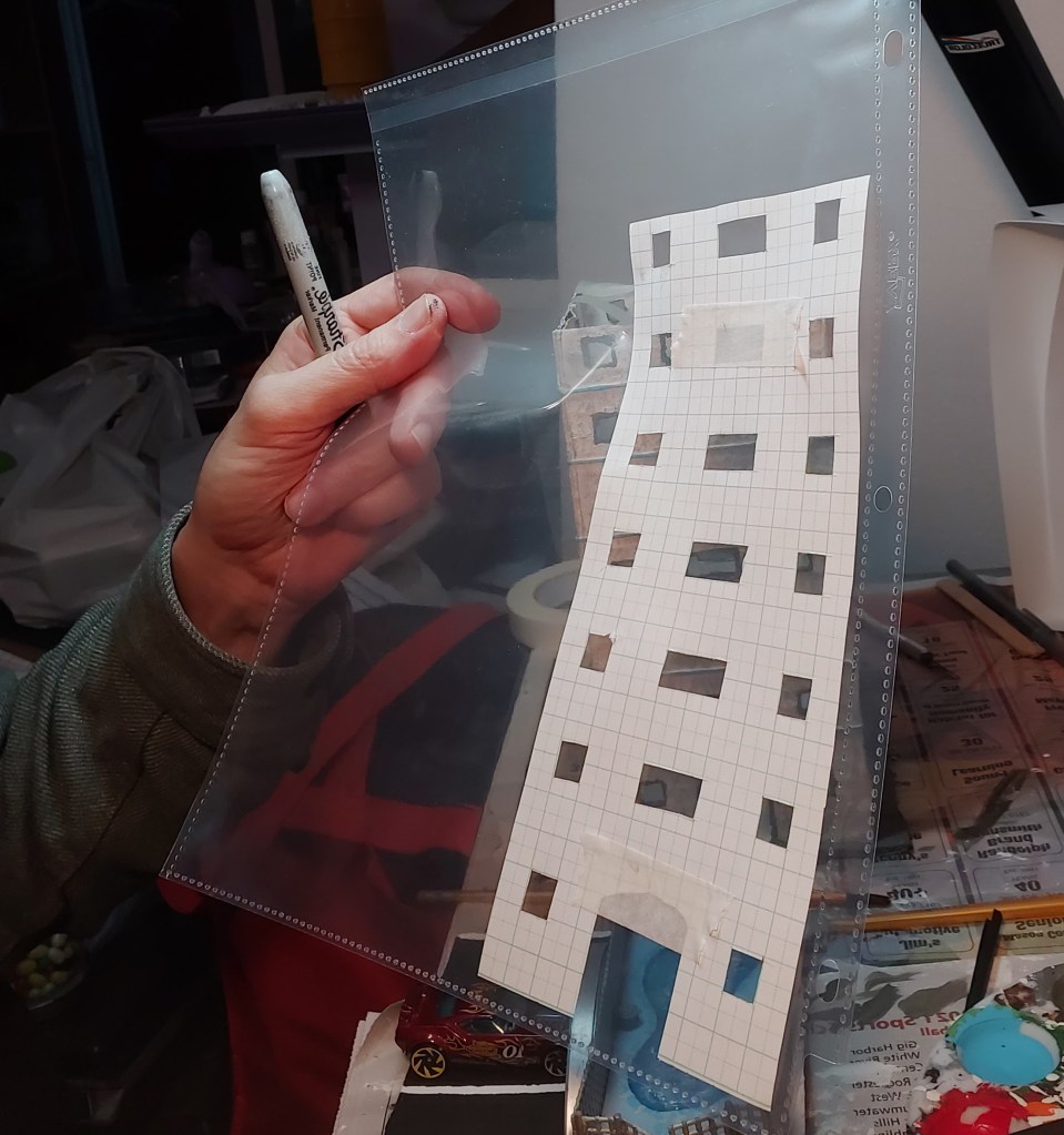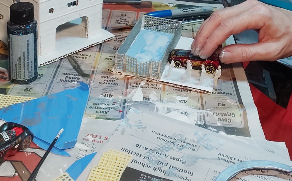 Above: removing masking tape to reveal parking lot stripes. For this effect, cut 1” masking tape down to ¼” widths, tape over the white, then paint black over the top. Test fit your cars first. The pool floaties are beads, the silver arch was part of a cottage cheese lid.