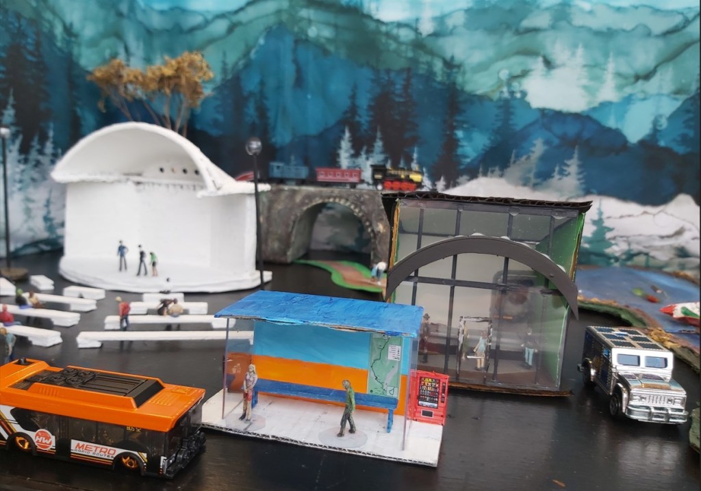 1. Plan, measure, mark and cut. This bus is about 2” long, so each bus stop will need two clear sides 1 ¾” H x 1 ¼” deep, a back 1 ¾” H x 2” wide, a sidewalk base 3” wide x 2” deep and a roof 2” wide x 2” deep. Keep the fronts open to allow access for figures.