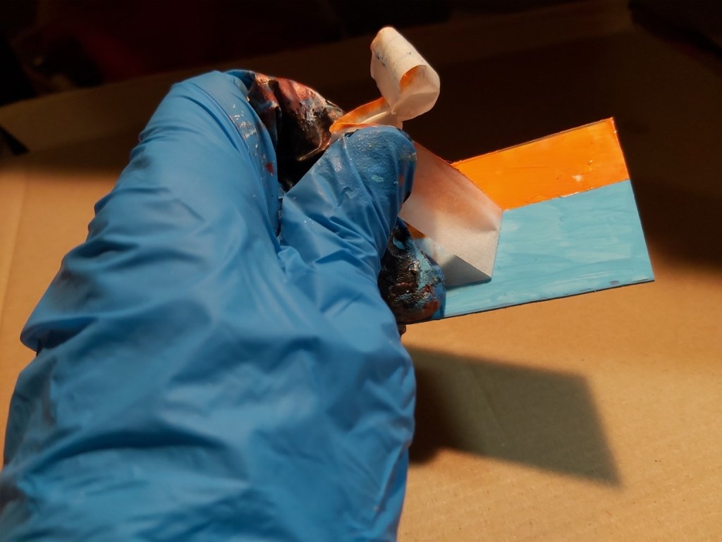 2. Pre-paint. Avoid getting paint on the clear pieces. Paint the sidewalk gray and white, the back in colors to match your buses and the roof. Use masking tape to paint straight lines. Paint a second coat also.