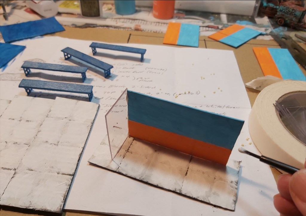 4. Add details such garbage cans, newspaper racks, vending machines, shrubs and sculptures about 1/2”. Shown: color printouts are glued to material painted to match.