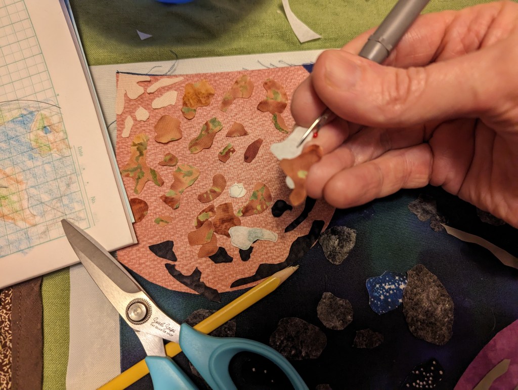 3. Cut & place – Use your fabric scissors to “fussy cut” along your pencil lines, leaving the paper of the fusible attached. Test-fit on your background, like puzzle pieces. Leaving background showing or overlapping pieces is fine. When you like where things are placed, peel off the paper and iron them down to glue in place.