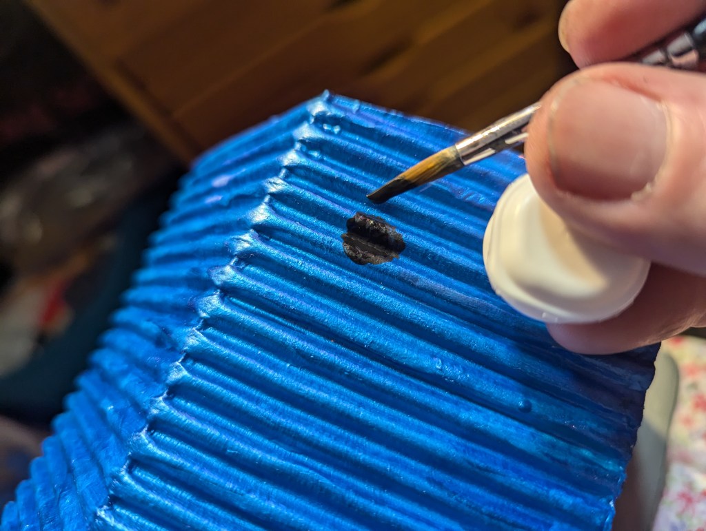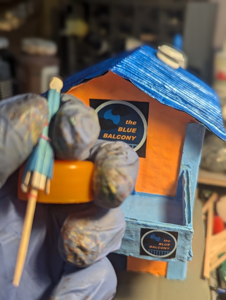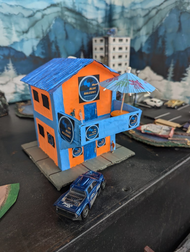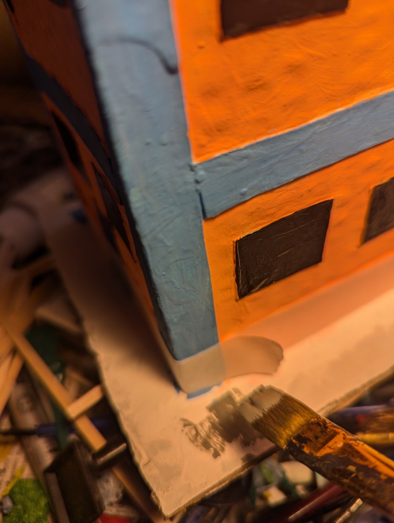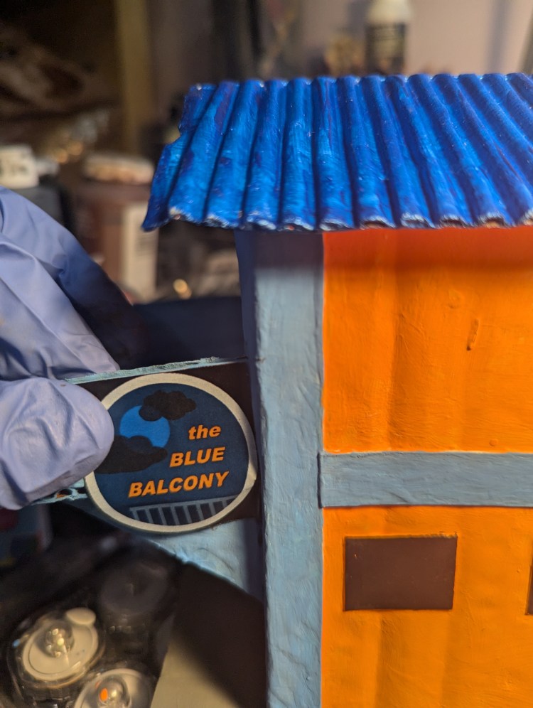 Prime/base coat everything in white, then paint it any colors you like. Neon orange contrasts with the blues to get them to pop. The roof and doors are metallic blue. The windows are glossy black and the balcony and trim are neon blue. Sidewalks are gray. Use painter’s tape for cleaner edges. Paint 2-3 coats, including touch ups.