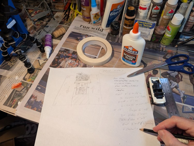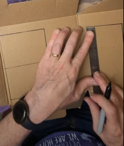 Use a ruler and marker. The square corner of a ruler gives you helpful right angles. A Hummer Hot Wheels Car measures 3” long x 1.5” wide, so we need 2” wide lanes. Espresso kiosks are about a lane wide also, so make a 6” square base divided into 3 lanes 2” wide.  Mark 2 sides 3” x 4”, 2 sides 2” x 3” and a roof 3” x 5”.