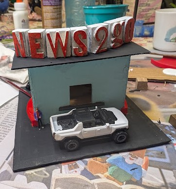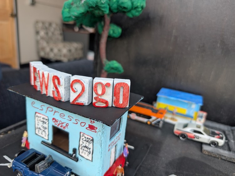 If you have craft letters, they pretty work well for signs. If they only come with one each of number and letter of the alphabet, you might have to rethink the kiosk name. News 2 Go was the 4th or 5th name, after Joe & News, Citizen Coffee, Java News and Hot News were considered and dismissed. Test fit for space on top of the building. Base coat letters in white.