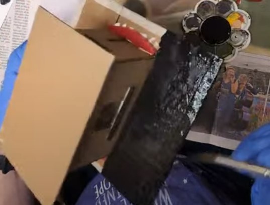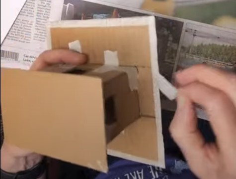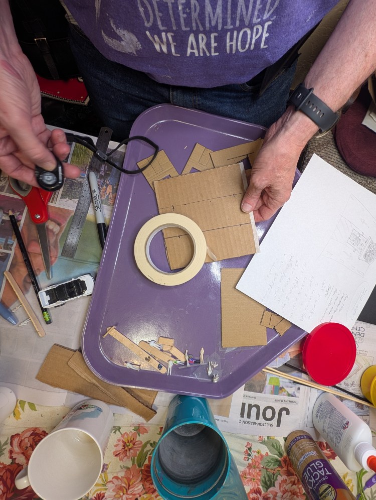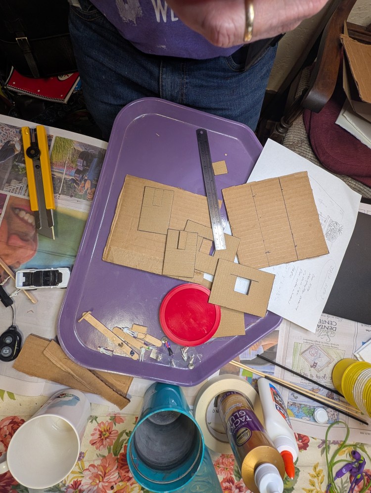 Well, remove most of it. Carefully peel off the tape where you’ve glued edges. If you used thick corrugated cardboard for the base like I did, put masking tape around the outside edge to tidy that up. You can paint right over it later.