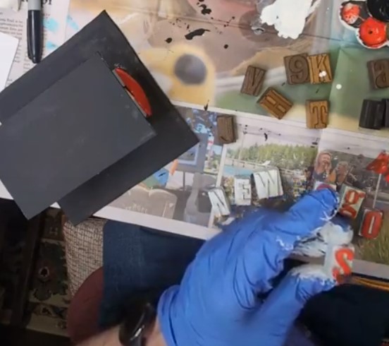 So the red will pop against the white behind it, dab your paintbrush on newspaper before painting the top of each letter so that the paint is not too wet. You only want to cover the top, flat surface. A flat brush works best for this. Paint lightly here, just a thin coat or two.
