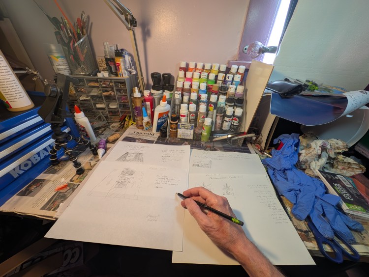 You can start before you think, or you can think before you start. In art, both are good and there’s nothing wrong with improvising. That said, when you’re inspired with an idea, write it down. Make sketches. You can create them later or change them however you like. The weakest pencil is stronger than the strongest memory. I made several sketches several weeks before picking this one to work up for you to try.