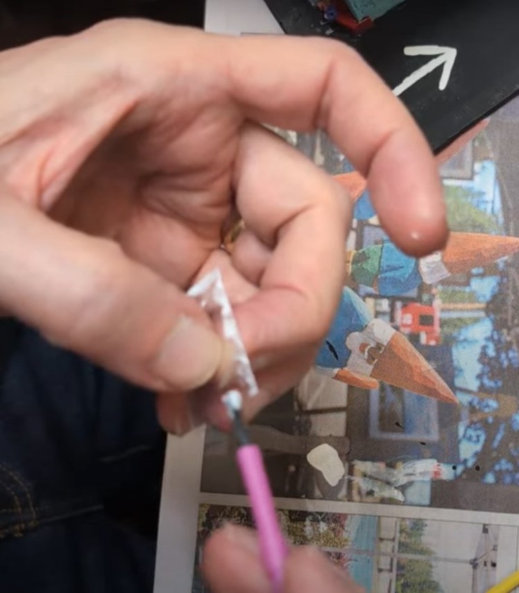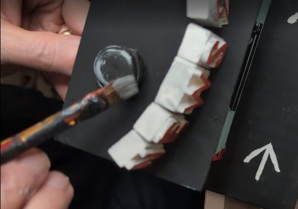 Before you glue, test fit the letters on the roof again. Pick letters up one at a time, use an old brush to apply glue onto the bottom of each one, and put it back exactly where it was as you go. Once they’re all in place, take a look and adjust placement before the glue dries – you have just a few minutes. School glue is water soluble, but it destroys brushes once it dries, so I use dollar store brushes for glue.
