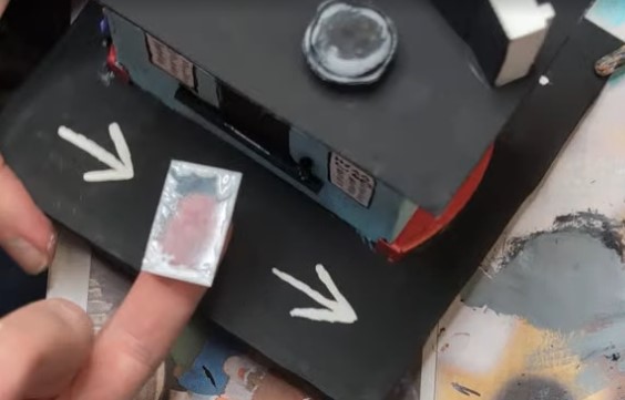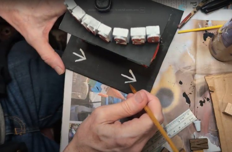 Using a medium round pointed brush, not too full of paint, start with the white. Direction arrows, menu boards and “TIP” on a jar on the drive through shelf (which is a cut down coffee stirrer, glued on). Paint even, straight lines and move the model with your other hand for better control.