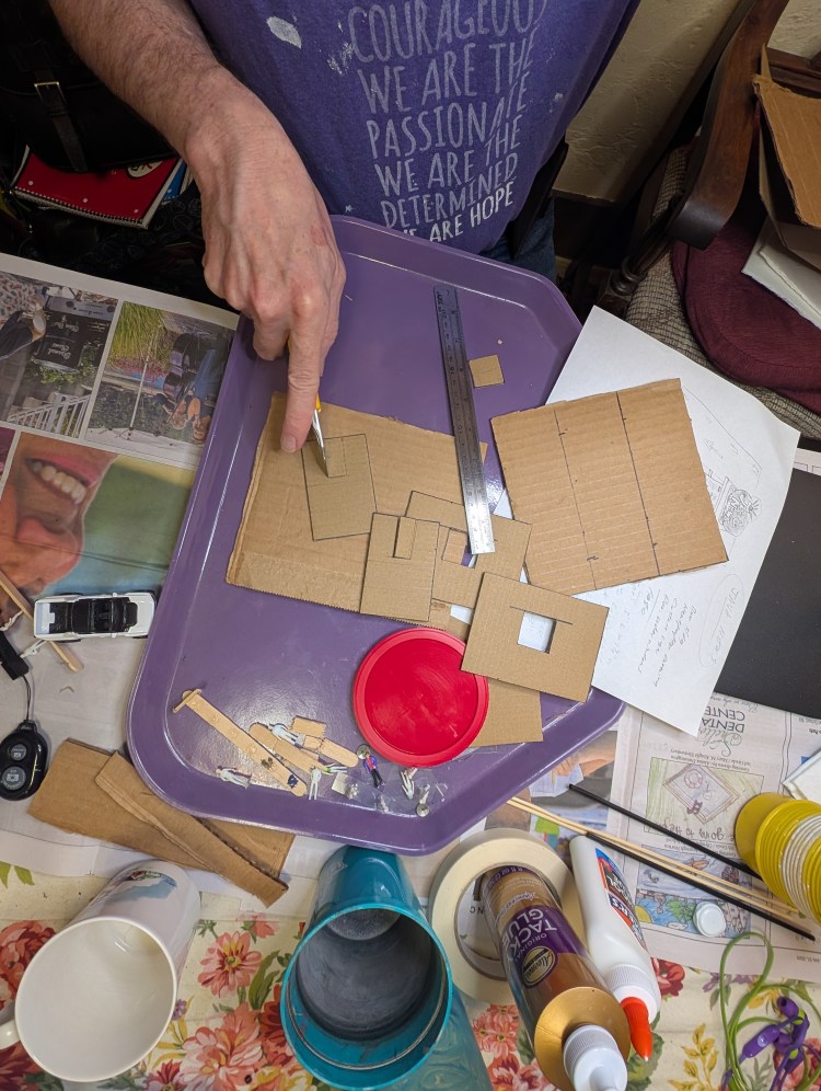Be safe and don’t rush with your sharp tools. Use scissors to cut right on top of the lines you marked. Cardboard is everywhere, so if you make a mistake don’t hesitate to start over. Thin cardboard from a cracker box is much easier to cut than thick corrugated box cardboard. If you want to cut door and window openings (optional) be careful and go slow with a craft knife, being careful to protect the surface underneath it.