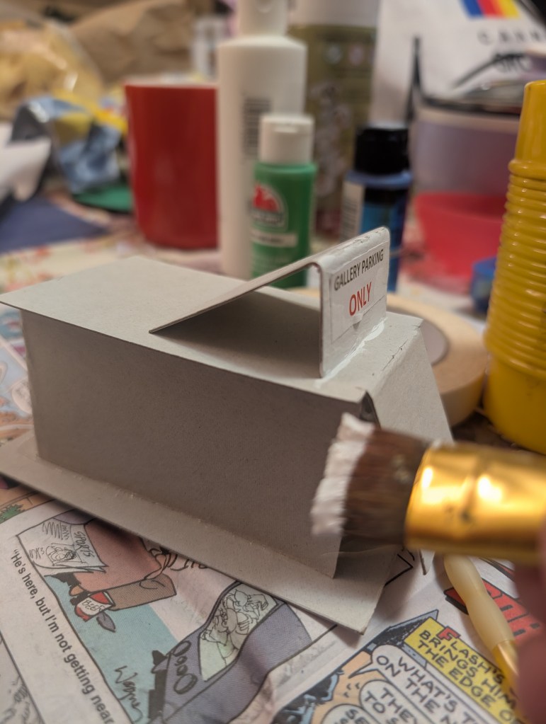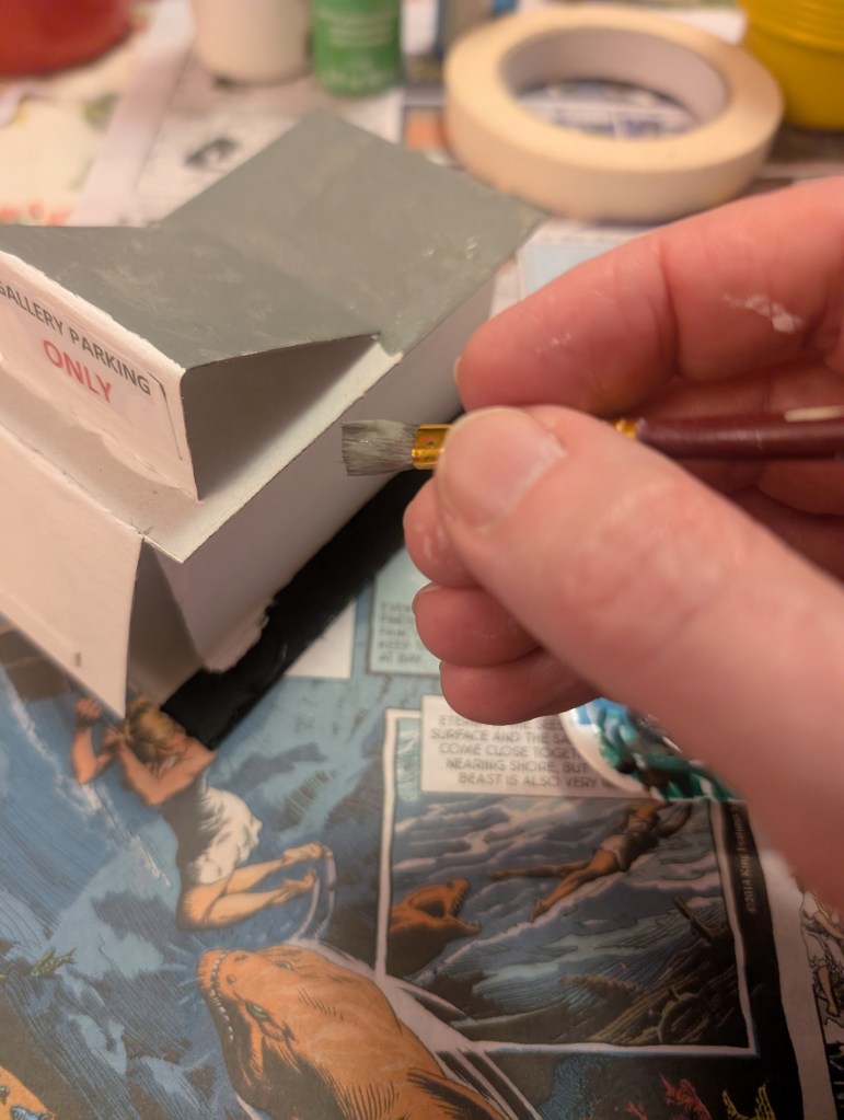 Use masking tape and/or glue with baking soda to tidy up any gaps. Once it’s dry, basecoat everything in white acrylic (water soluble) paint. Once that’s dry, paint the parking lot and porch poles black, the concrete sidewalks gray, and the roof blue. Leave the building white. While the paint dries, study your reference photos.
