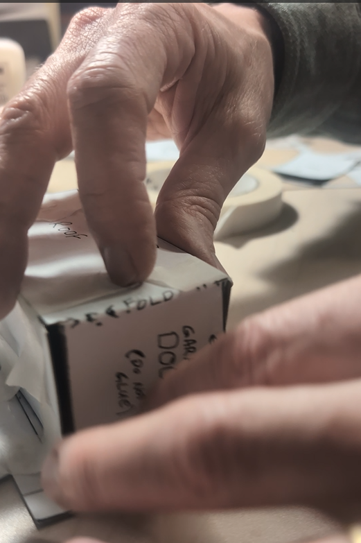 Cut a hole in the base large enough for your hand to reach in. Glue a 6” square for the roof, adjusting to fit. Trace the pencil lines of the windows, seams and edges with lines of glue. While the glue is wet, drop handfuls of sand onto the glue and gently shake off the excess. Let dry. This process is called flocking and it is a wonderfully easy and cheap way to add strength, texture and detail to fine scale models.