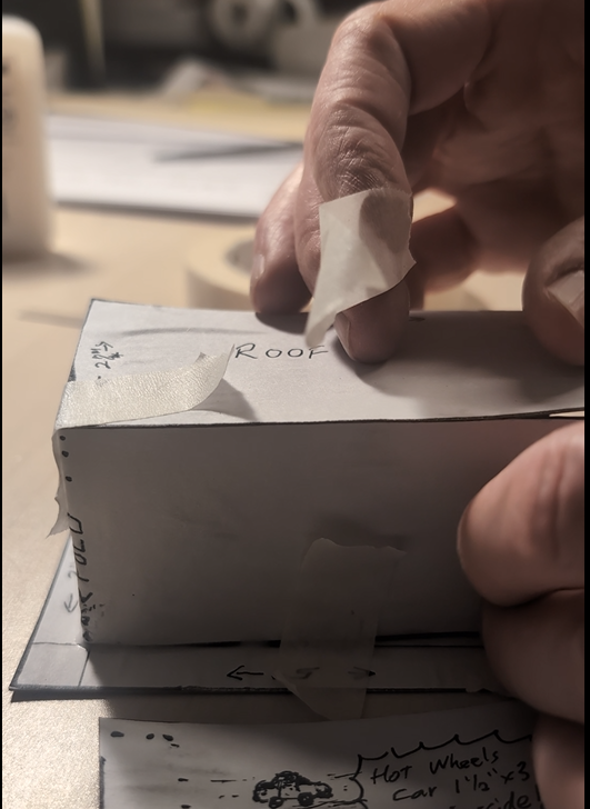 Use a ruler and marker. The square corner of a ruler gives you helpful right angles. A Hummer Hot Wheels Car measures 3” long x 1.5” wide, so we need 2” wide lanes. Espresso kiosks are about a lane wide also, so make a 6” square base divided into 3 lanes 2” wide.  Mark 2 sides 3” x 4”, 2 sides 2” x 3” and a roof 3” x 5”.